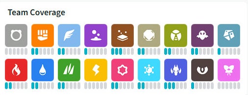 Team Coverage, meanwhile, informs you which Pokémon types your team has an advantage over. The more little blue bashes beneath a type, the more Pokémon you have in your team that can counter it. If a type doesn't have a dash at all, then you might want to consider changing your team!