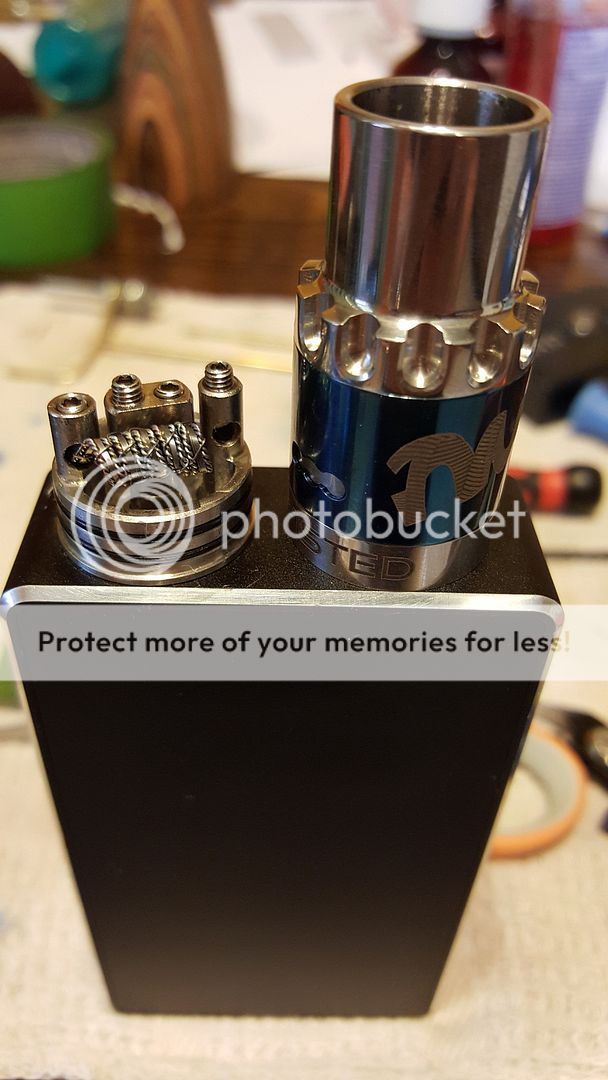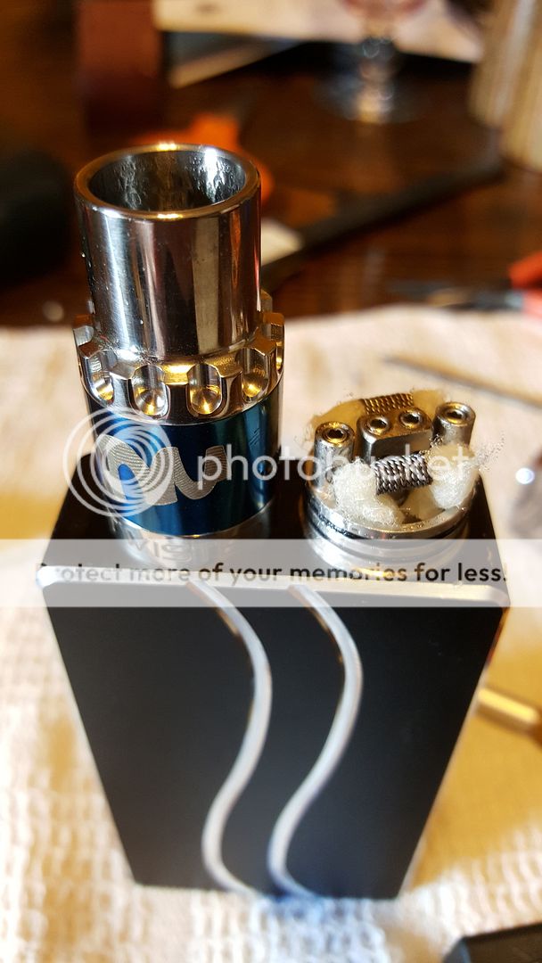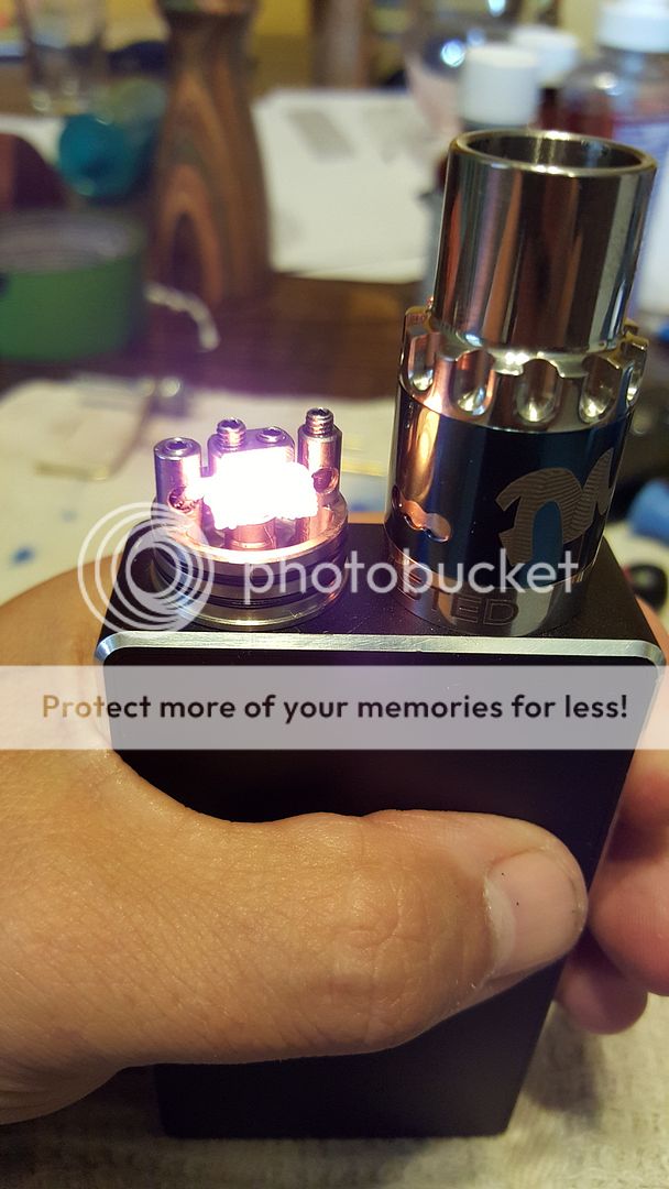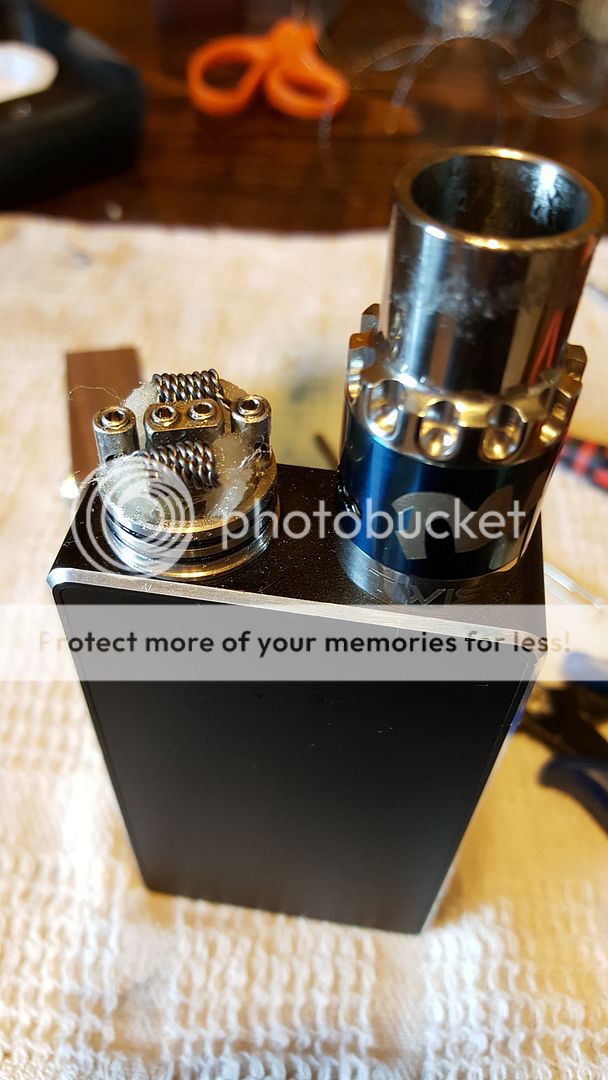 ok ok, i'll put one up. i seriously gotta figure out how to get it off my phone and onto here, my girl does all that shit for me lol. i'll describe it in the interim. look up the youtube video for the transformer coil. it's very similar BUT......its two tiger coils (twisted ribbon and kanthal 30g.) loosely claptoned over with more ribbon, with twisted lightly flattened 28g kanthal in parallel. i got the idea looking at the video, he was saying it doesn't wick so well and i remember a previous build i made with tiger coil and how well that sucked up the juice. claptons do too,and ribbon does some interesting stuff when you twist it and i happened to have some nice pieces of tiger laying around, and i put it together ( took over an hour to get it right even though i had most of the parts made already). 4 wraps, .16 ohms, the coils sucks up juice beautifully! i also twist every strand of kanthal before i start building. i did not come up with the transformer coil, Koojax from Vapor Hut is the creator. and he had a great idea. im still tweaking my design but im waiting for more wire, i just ordered more today. so........yeah