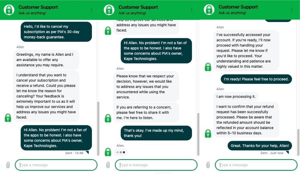 I tested PIA’s live chat feature on several occasions. I wanted to find out if PIA’s 30-day money-back guarantee covers all subscription plans (it does) as well as just how many servers the service offers (PIA doesn’t disclose this). Fortunately, I largely PIA’s support to be quick and helpful. I never had to wait more than a minute or two for an agent to become available and usually had the information I needed within minutes.