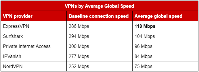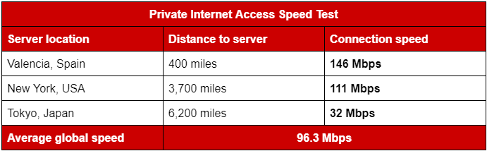 PIA’s global average speed worked out to 96.3 Mbps, brought down rather significantly by its very slow Tokyo servers. However, this average was still ahead of both NordVPN (75 Mbps) and IPVanish (83.6 Mbps). The likes of Surfshark (104 Mbps) and ExpressVPN (118 Mbps) came out on top, thanks to their more consistent speeds across the three server locations tested.