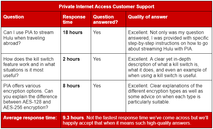 Live chat is expected to be quick but response times to emails can vary wildly. To test PIA’s email support, I sent three different emails, all on different days and at different times of day (morning, afternoon, and evening). With an average response time of just over 9 hours, PIA isn’t especially fast compared to ExpressVPN. However, the quality of its answers were far better than any other VPN I’ve tested. Overall, its support is really very good.