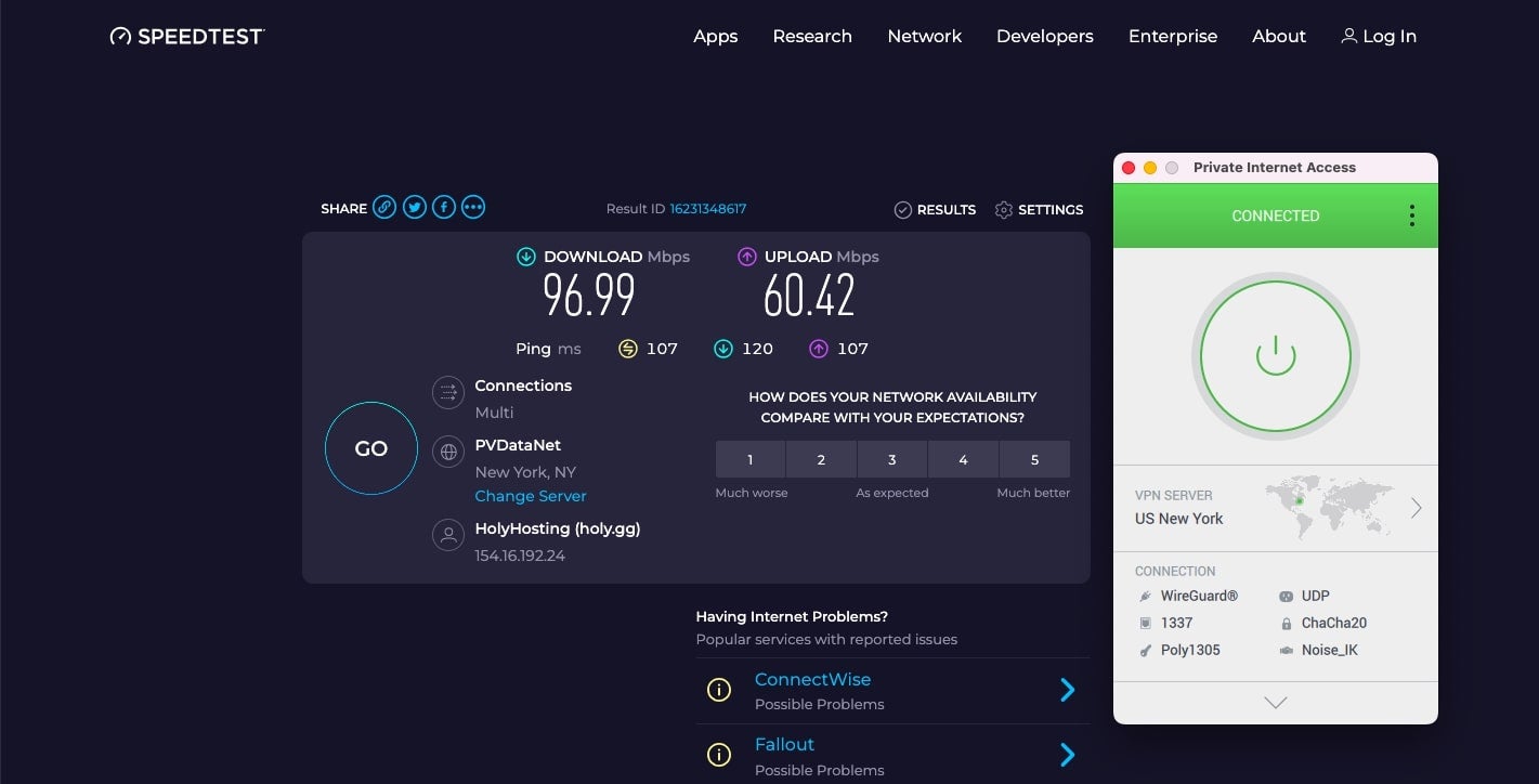 As is to be expected, my connection speed was far faster when not connected to PIA (300 Mbps). My fastest speeds when connected to the VPN were on its Valencia servers (146 Mbps). Despite the much greater distance between my location and New York, there wasn’t a significant dropoff in speed (111 Mbps).