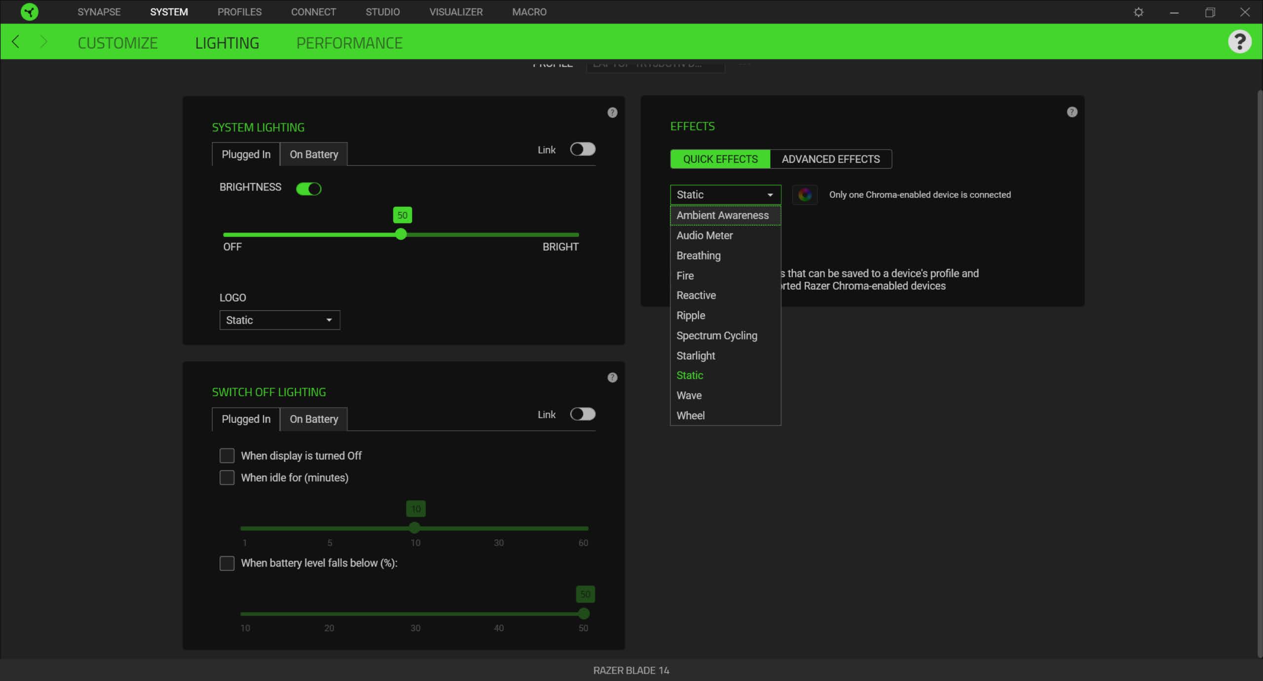 Like most Razer products, the Blade 14 makes extensive use of its Synapse customization software. The software allows for customization of the keyboard and system lighting and offers some simplified performance settings for the larger laptop. These are broken into the Customize, Lighting, and Performance tabs.