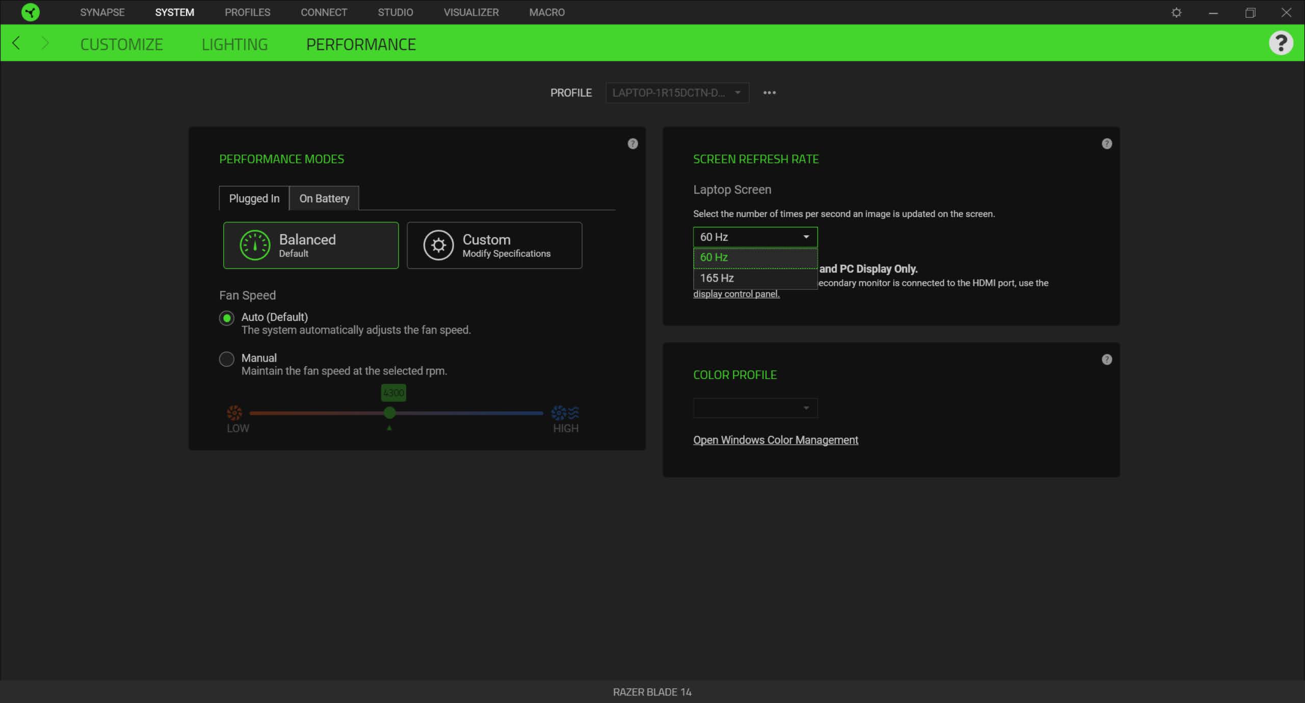 The Performance tab is arguably the most important of the bunch but is also the most limited. Here, you’ll be able to choose your default performance mode when plugged in or running on battery, set a static fan level, and swap between 60Hz or 165Hz refresh rates to save on battery. Performance modes are limited to Balanced and Custom. Inside the custom settings menu, the CPU and GPU can be set to low, medium, or high performance, and Boost for the CPU only.
