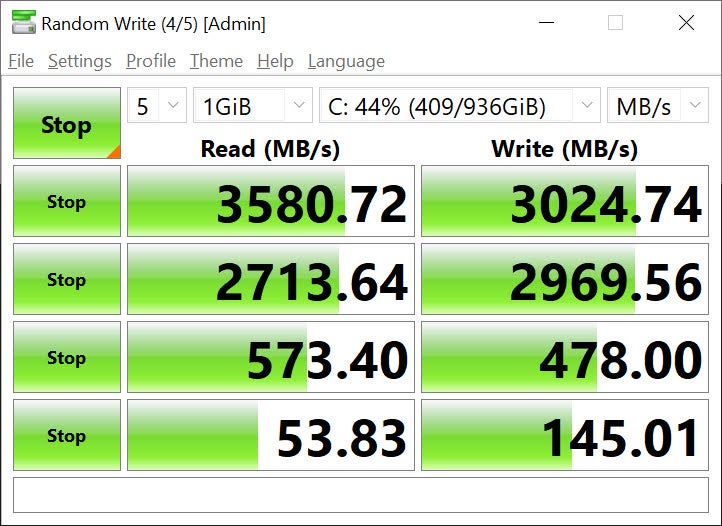 To test the SSD, I ran the laptop through a series of tests using the CrystalDiskMark benchmark. This synthetic test runs a series of read and write tests ranging from the easiest on the drive, where it can anticipate upcoming data, and the hardest, where it cannot. At peak, it offered 3.6 GB/s read speed and 3 GB/s write speeds. These speeds are more than sufficient to minimize in-game load times and will provide a solid speed boost to file transfers.