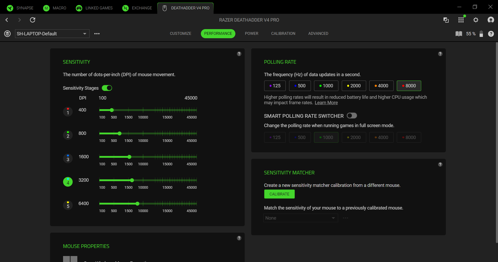 Thankfully the core features of Synapse – the most important ones for day-to-day use – are simple and easy to manage. With a few clicks, you can customize five different stages of sensitivity and switch between polling rates. You can also adjust what information the hemisphere dongle shows with its three LEDs. I decided to forgo the “connection quality” for a light that showed me my current DPI, and then I adjusted the colour for each DPI setting. As somebody who switches DPI between games, I found it useful to always know what I’d picked.