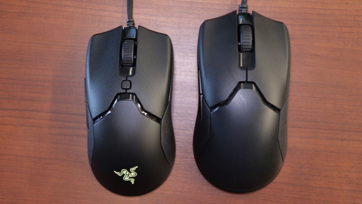 Name aside, the Viper Mini is small but still bigger than your average laptop mouse, so you shouldn’t be too worried about the overall size. It’s a close match to the Logitech G305, for example, but sat next to the original Razer Viper, it’s clear at a glance that Razer has slimmed the mouse down across every dimension. It’s a full half-inch narrower in the center of its hourglass shape, a third of an inch shorter, and just a touch lower at the palm. Razer recommends the mouse for palm and claw grips and it’s easy to see why. It may not look like much on paper, but it definitely feels much smaller in the hand. There are a handful of physical changes, too. The DPI button has been moved between the mouse buttons instead of being placed on the bottom of the mouse, making it much more convenient to press. Razer has also axed the thumb buttons on the right side, which the company calls “false ambidextrous” and cuts the total button count down to six. The Speedflex cable is also a foot shorter at only six feet. The biggest change, apart from size, is that Razer has removed the rubber side grips and made the mouse feel more slippery in the hand. On the plus side, the company brought the excellent pure PTFE glide feet from the Viper Ultimate, which allows it to be extra fast regardless of mouse surface.