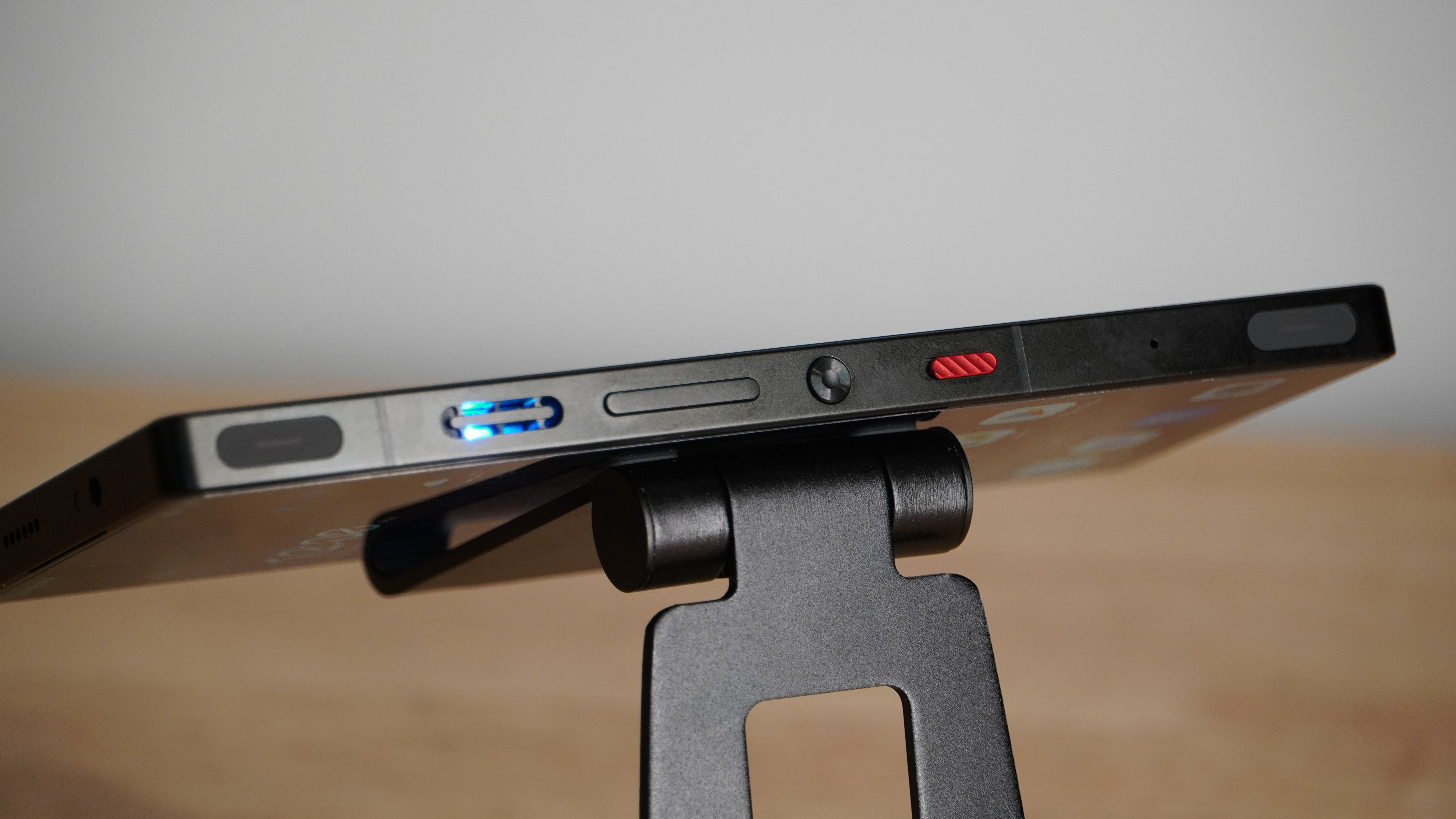 For its design simplicity, there’s still a lot going on. The RedMagic 10 Pro still features an active cooling vent that pulls air in from one side of the phone and pumps it out the other. The fan itself is visible through the back glass and lines up with the two rear cameras. Along the top edge of the phone, you’ll find a 3.5mm headphone jack (yes!), a speaker, a mic, and an IR emitter found on many Chinese phones giving them the ability to double as a universal remote control. The bottom of the phone houses a 10Gbps USB-C port with DisplayPort output, another mic, another speaker, and the phone’s dual-SIM tray. Unfortunately, the RedMagic 10 Pro only supports physical SIM cards, not eSIM, which can make getting setup with regional networks while traveling more difficult.