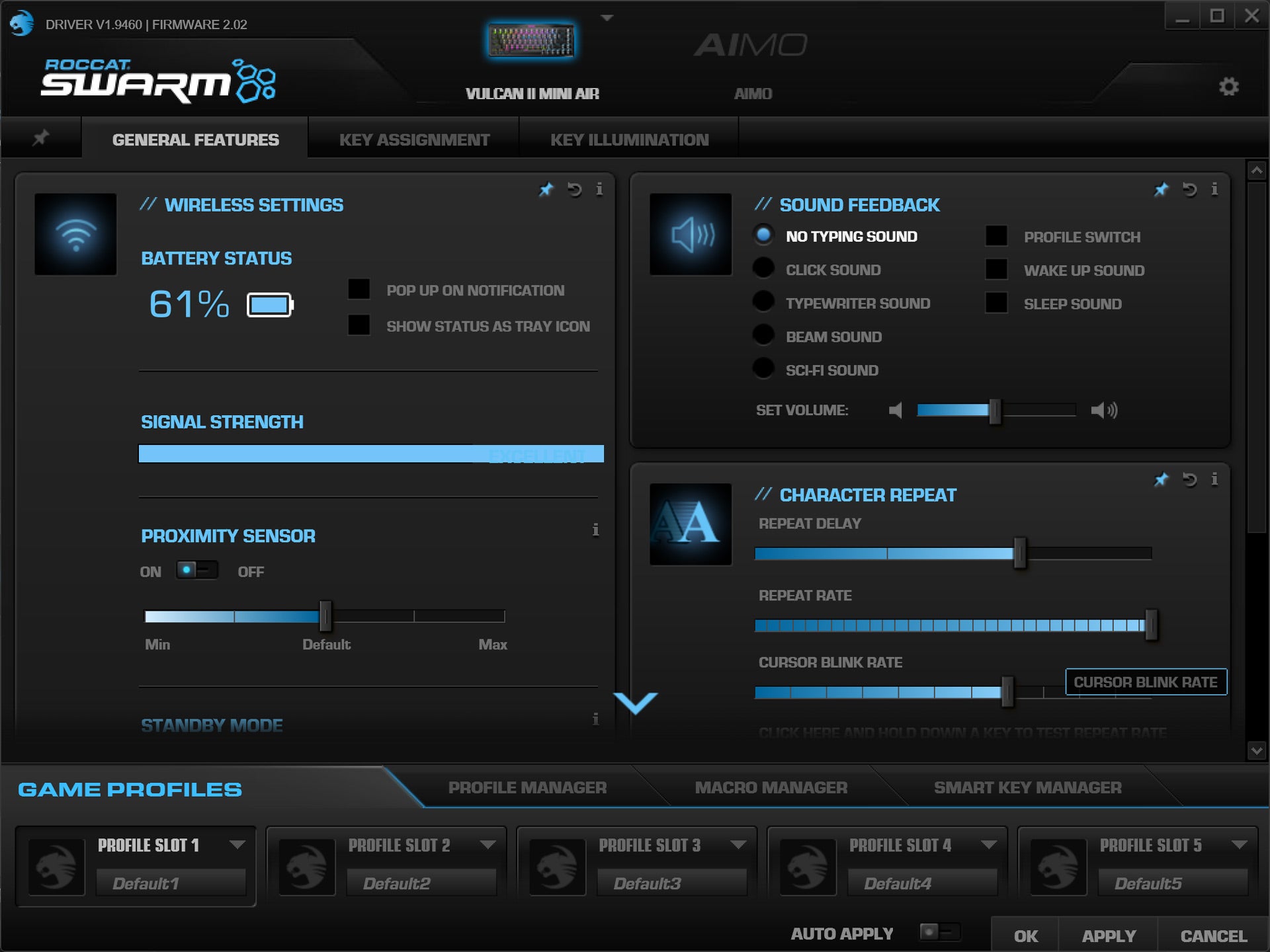 The suite is broken into three tabs for adjusting its basic functions, programming keys, and adjusting lighting. The General Features tab is simple enough and allows you to adjust sliders for the proximity sensor and how quickly characters repeat (plus a blast-from-the-past option to have each keystroke make typewriter or spaceship sounds).
