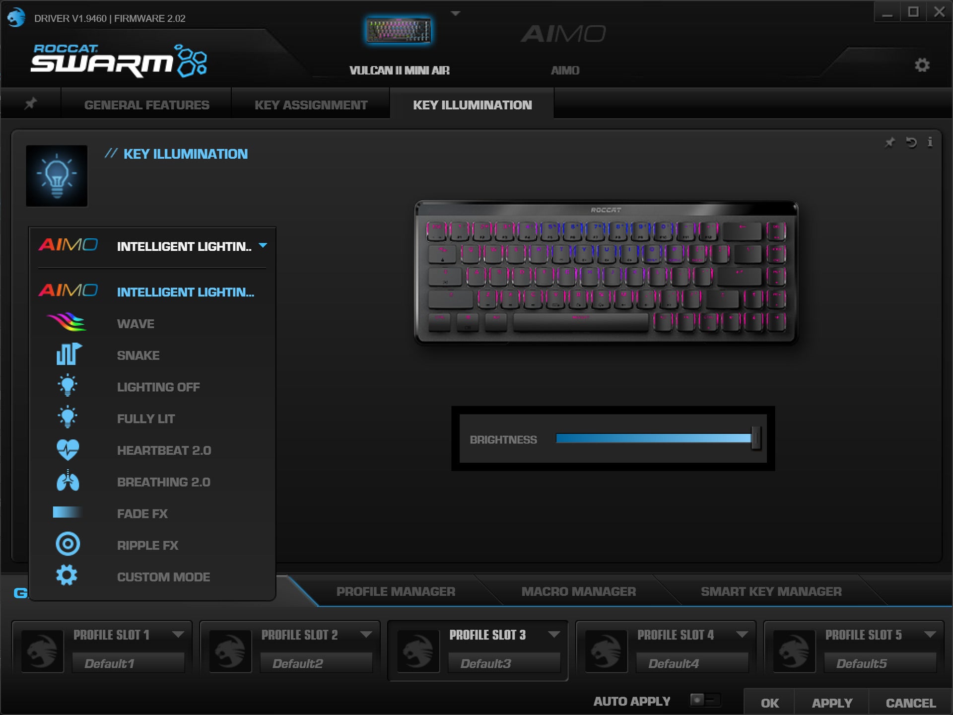 Lighting is better, but doesn’t shake the feeling that this software is long in the tooth. You can choose from ten preset lighting animations including the usual rainbow wave and ripple effects, as well as a neat AIMO “Intelligent Lighting” mode that reacts to your keystrokes and shifts between grades of color. If you want to make your own color scheme you can, but though the lighting can look great in the end, the customization process feels pretty bare bones.