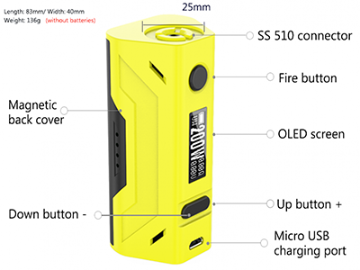 The Smoant Battlestar 200W TC Box Mod max output up to 200w, powered by two18650 batteries, supports resistance as low as 0.05ohm under temp control mode, supports NI200,TI,SS,TCR output modes, and a temp control range from 100 to 300 degree. The front of Smoant battlestar has a bright and clear OLED screen for easy reading.