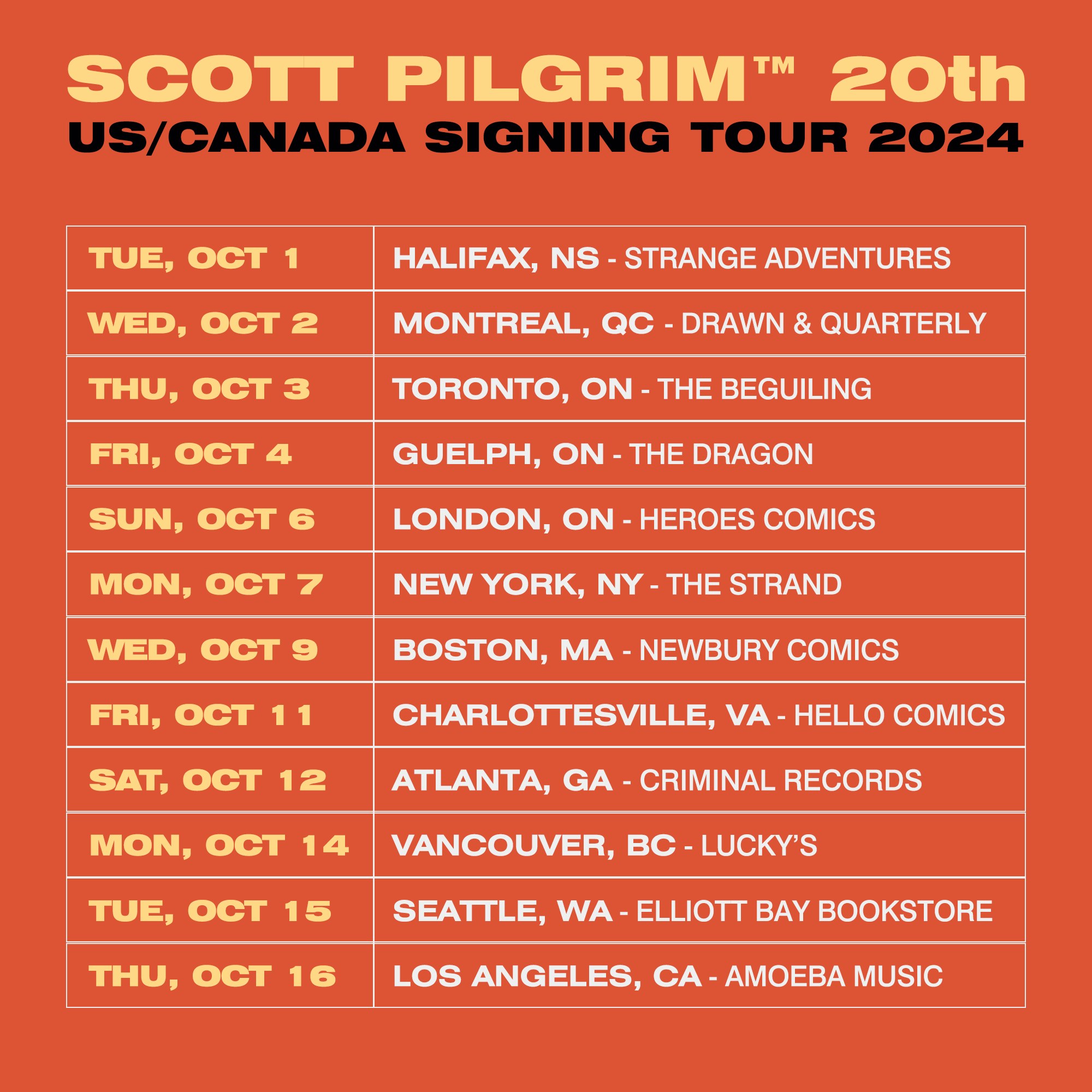 O'Malley will be visiting 12 comic shops and bookstores in Canada and the US during the month of October. The full list of appearances is below: