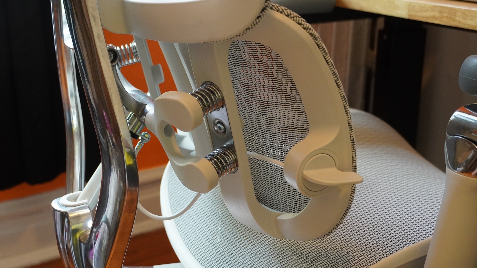 A small dial in the control cluster underneath the seat unlocks reclining. It has three settings – one locks the chair upright, a second that lets the chair recline a relaxed 110 degrees, and a third that lets the seat swing back 130 degrees (which feels much further back). There’s no fully locking the chair at any of the reclined angles in between, which is a shame to see, especially as the 130-degree recline can feel a bit much at times. A dial allows adjusting the tension of the reclining mechanism, but even at its most tense, it feels a bit weak. With it looser, I felt like the backrest wasn’t even there and I’d fly out of the back of the chair.