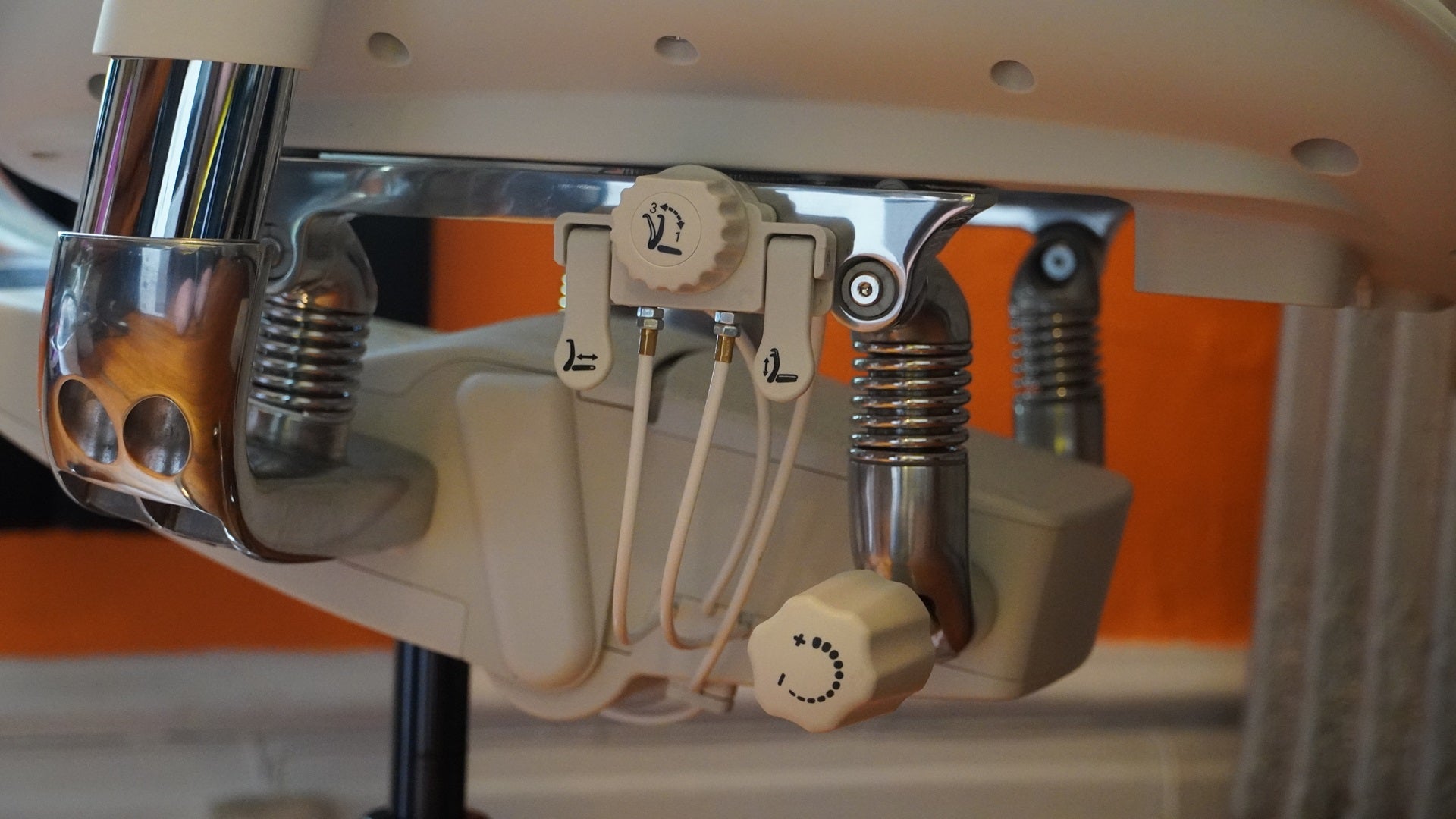 Below the upper portion sit two independent lumbar supports. With these attached to springs, they can conform to the shape of your lower back. And they have a small piston of their own that will push them further into your lumbar. The controls for this piston sit right next to the lumbar supports on the right side.