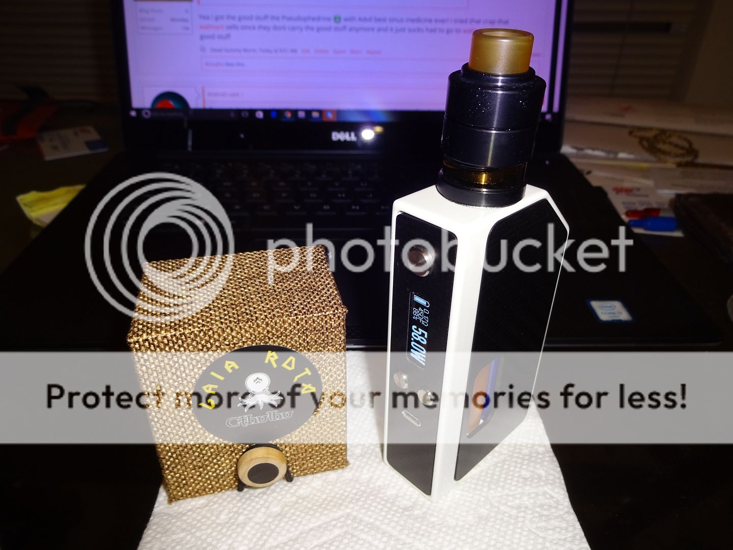 Catfish DNA 200 squonker with GAIA RDTA, the lazy man's squonk atty.....just fill the tank squonking when it's low....really a fantastic atty....!Take pity on the new guys, give a description of what's in the picture, at least that way we'll know what we're drooling over!