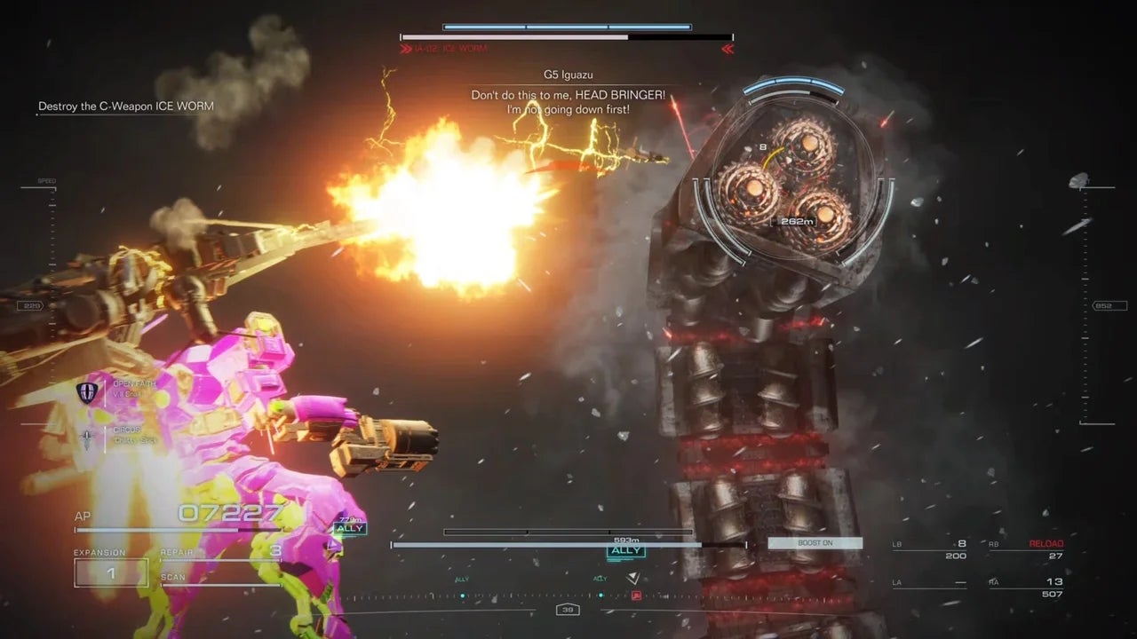 AA P07 Balteus is a swift and merciless spectacle, infamous for its screen-filling swarms of guided missiles. It’s a Genichiro-like gatekeeper that tests your true mastery of Armored Core 6’s systems ahead of bigger challenges. IA-02: Ice Worm, meanwhile, builds upon the event-style boss design established in Elden Ring’s Starscourge Radan fight. Utilising a team of allied NPCs, an off-screen mega-cannon and a bespoke missile launcher, it’s perhaps the most cinematic battle FromSoft has ever crafted. Finally, IB-01: CEL 240 demonstrates the studio’s flair for the dramatics with an outstanding, rapid-fire second phase that wholeheartedly embraces the projectile-dodging action unique to Armored Core.