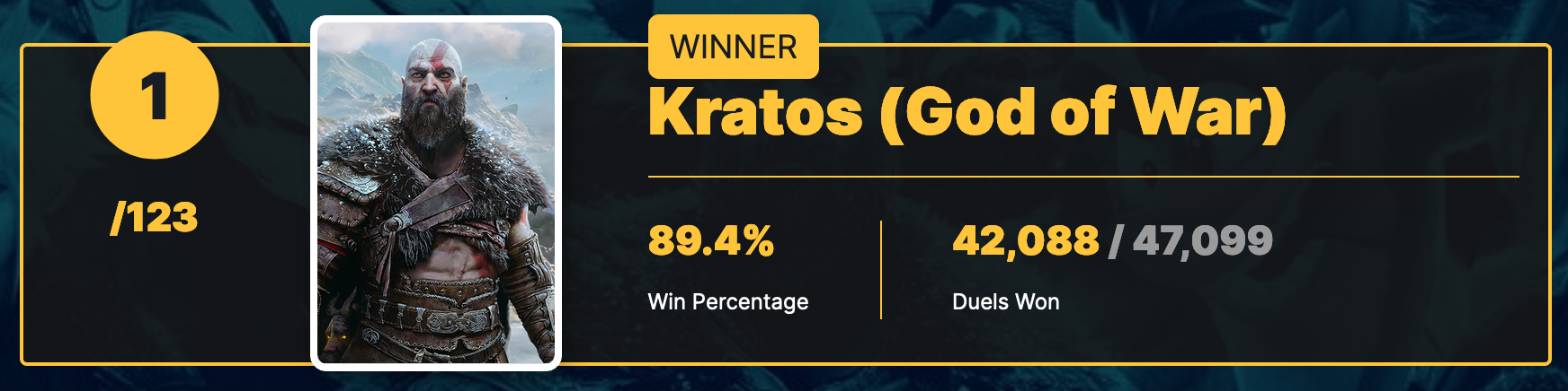 BOY... what a choice. With an 89.4% win percentage that's worthy of the gods, Kratos has defeated all who stood in his way yet again to claim this coveted Platinum Trophy. The star of God of War Ragnarok and the character who first appeared on PlayStation 2 in 2005 secured victory in 42,088 of his 47,099 battles.