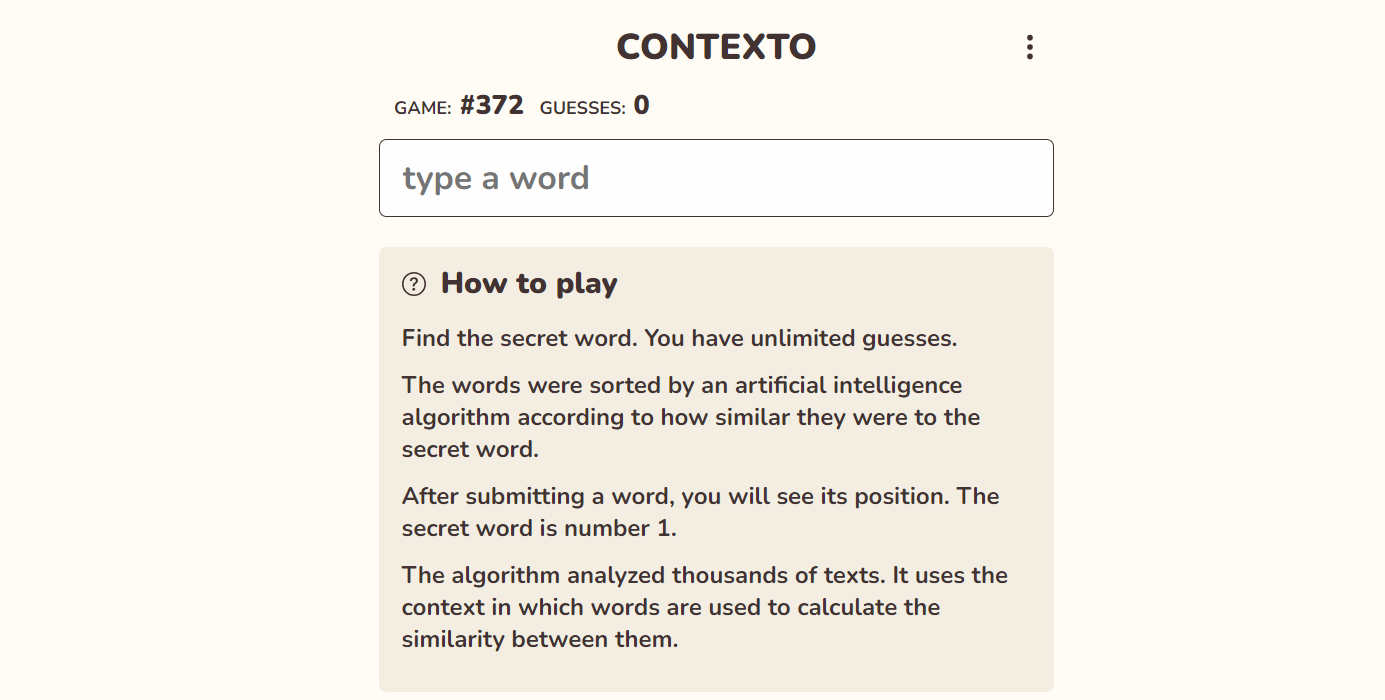 A wholly unique browser-based word game, here you’ll be guessing a new word every day similar to Wordle, but instead of correct letters you’ll receive contextual information from an algorithm about how close/similar your word is to the secret word. With the secret word being #1, the number you’ll get after each of your unlimited guesses will tell you if you’re getting warmer or colder. Have fun with Contexto and don’t tear your hair out!