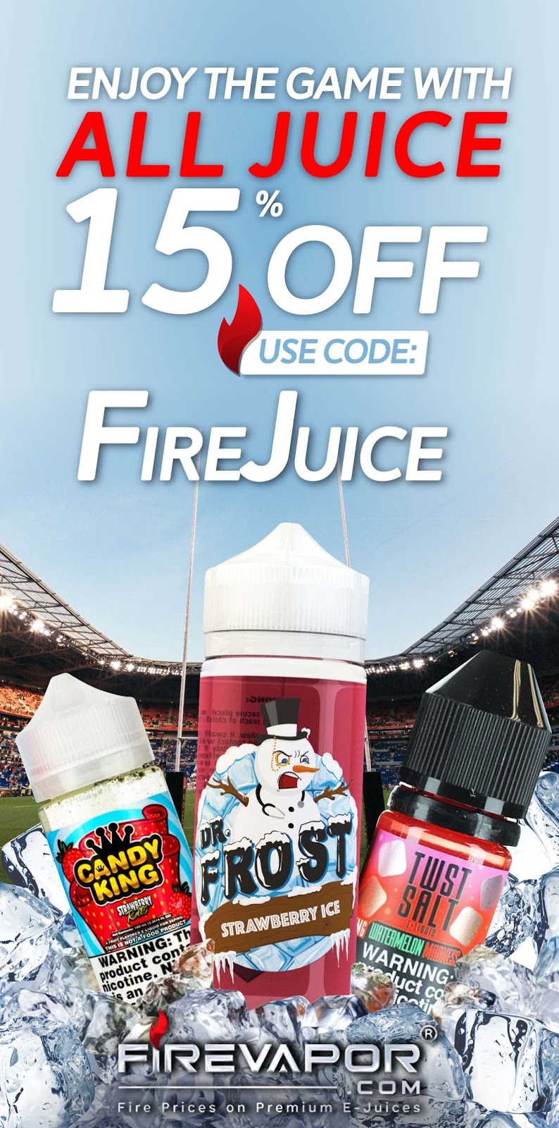 It's the big game and FireVapor is having a big sale! Everything is on sale! All juice, hardware, and replacement heads are on sale. Even items that are already discounted are still able to use the coupon code.