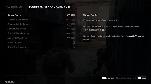Aside from combat, there’s a slew of traversal assistance built-in now, as well as a Skip Puzzle option for those unable to progress due to eyesight limitations. However one of the biggest additions Naughty Dog added was Cinematic Descriptions. This causes cutscenes to be fully narrated, giving the player spoken descriptive audio of key visual elements during a scene, without interrupting the character’s dialogue.