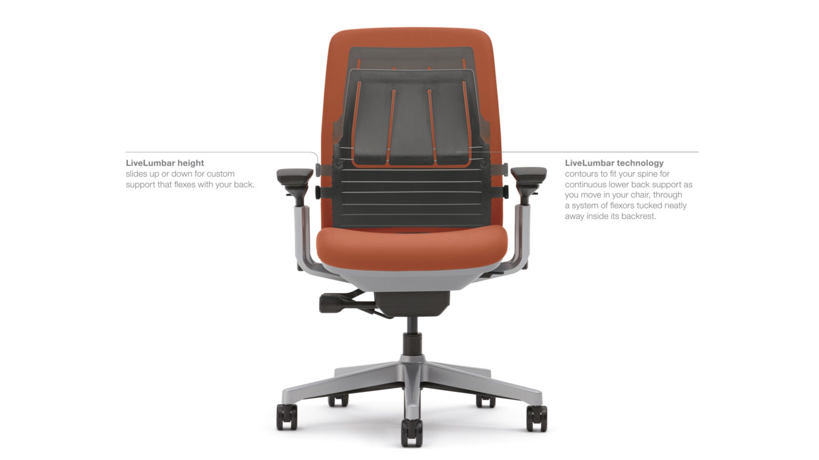 Hidden behind the backrest panel is the Amia’s LiveLumbar system, which is meant to be more reactive to how you’re actually sitting in the chair. Instead of using a pillow, an internal bulge, or a chair’s natural curvature to support your back, the Amia instead uses three flexible panels (pictured above). Each panel can move individually, so whether you’re leaning or completely twisting in your seat, the backrest will flex to match your movements and pressure. This is mainly for the mid- and upper-back, however. The lower back uses flexible horizontal panels to provide sturdier support and has an adjustable slide to adjust how high on the back the curve begins. This is how the Amia is able to support both smaller and larger users at the same time.