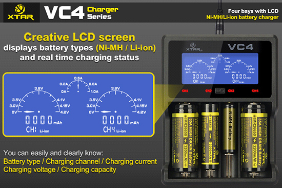 XTAR VC4 is not only the upgraded version of both VC2 and XP4c chargers, but also the combination of our principle to keep making progress and taking the responsibility for the safety and environment protection. The VC4 can recognize display charge Ni-MH and Li-ion batteries at the same time and it also displays the charging current, battery voltage and charging capacity.