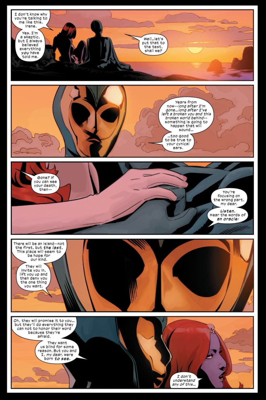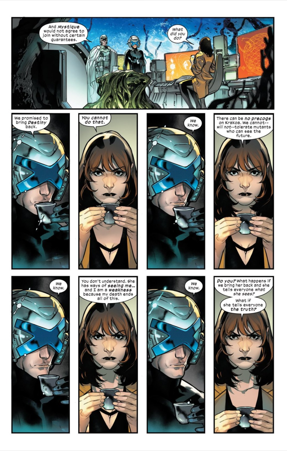 Art by RB Silva. (Image Credit: Marvel Comics)[/caption] In order to safeguard Krakoa, Xavier and Magneto have elected to deny Irene Adler her second chance at life. But that hasn't stopped them from dangling the prospect of Destiny's resurrection like a carrot on a stick in order to force Mystique to toe the line. X-Men #7 shows Mystique risking her life by returning to Orchis' orbital space station. There she discovers the X-Men failed in their mission to stop the creation of the futuristic Sentinel Nimrod. Xavier and Magneto order Mystique to return again and assassinate Orchis scientist Dr. Gregor before Nimrod is completed, telling Mystique she has to "earn" Destiny's resurrection. After reluctantly agreeing, Mystique reflects back on a conversation she and Destiny shared years before. Destiny warned her wife that an island would be created and Mystique would be offered a new home, only to be denied the one thing she craved most. Destiny urged Mystique to do everything in her power to bring her back. And if that fails, Destiny made one simple request - "Burn that place to the ground." [caption id="attachment_2301980" align="aligncenter" width="925"]