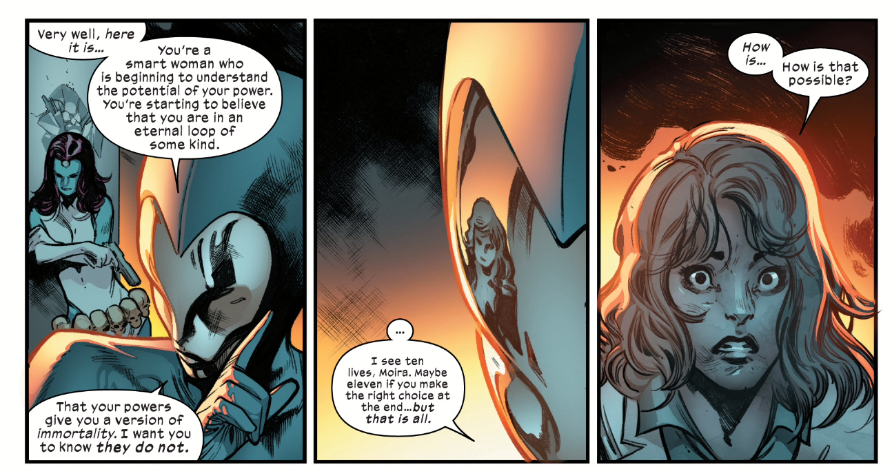 The end of Moira's third life. Art by Pepe Larraz. (Image Credit: Marvel Comics)[/caption] Moira has done as Destiny asked. Now in her tenth life cycle, she's guided Xavier and Magneto as they've built Krakoa and established a better future for the mutant race. However, she's done so from the shadows. No one else is aware Moira is still alive, much less that she's died and been reborn in utero nine times. That arrangement has worked so far, but there's a big catch. Now that Xavier has the technology to resurrect dead mutants, there's theoretically no reason he couldn't bring Destiny back to life. In fact, the prospect of seeing her wife resurrected is the only reason Mystique has been cooperating with Xavier and Magneto. But Destiny's resurrection is something Moira fears above all else. She refuses to allow any precognitive mutants to live on Krakoa, for fear her secrets will be exposed and a target will be painted on her back. What's the point of all this hard work if someone can assassinate Moira and reset the X-Men timeline back to square one? [caption id="attachment_2301981" align="aligncenter" width="915"]