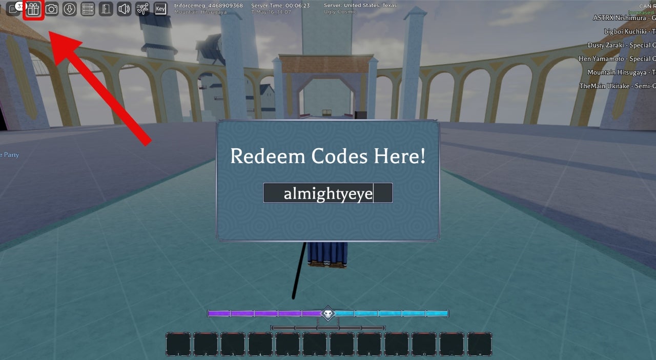 To redeem a code in Type Soul, boot up the game, jump into a server and then click the gift icon in the top left-hand corner of the screen. This will pull up a text box where you can redeem codes. Input your chosen code and hit enter. If the code's valid, it will be redeemed. If it isn't, a message reading "Invalid" will appear in the box.