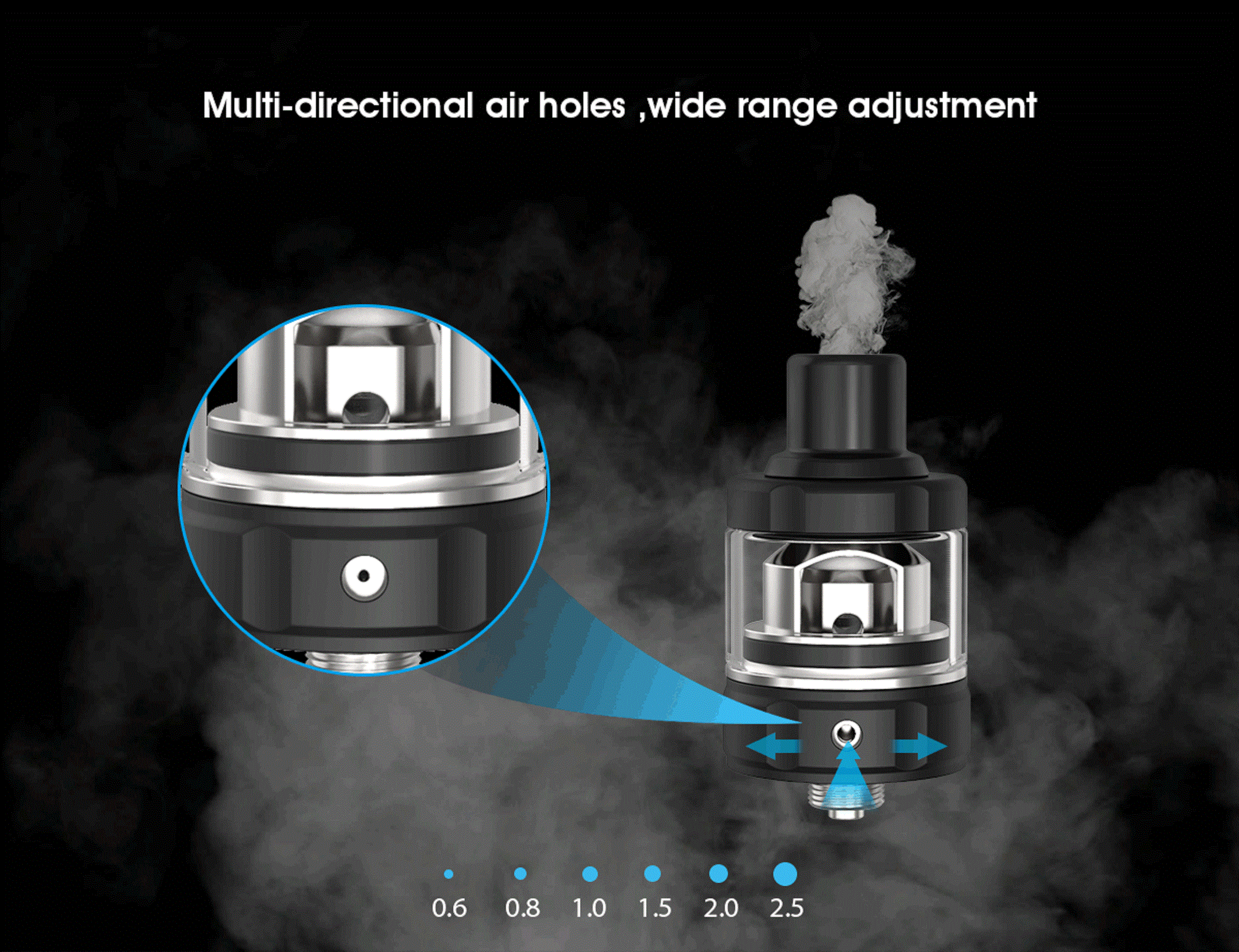 The Apollo has bottom airflow and the airflow control ring has a 2.5mm hole just one side. When turning the airflow control ring you line the hole up with different size airflow holes on the base, the size of the holes are 2.5mm, 2.0mm, 1.5mm, 1.0mm, 0.8mm and finally for a super tight draw 0.6mm. The control ring moves with just the right amount of tolerance and has a stopper.