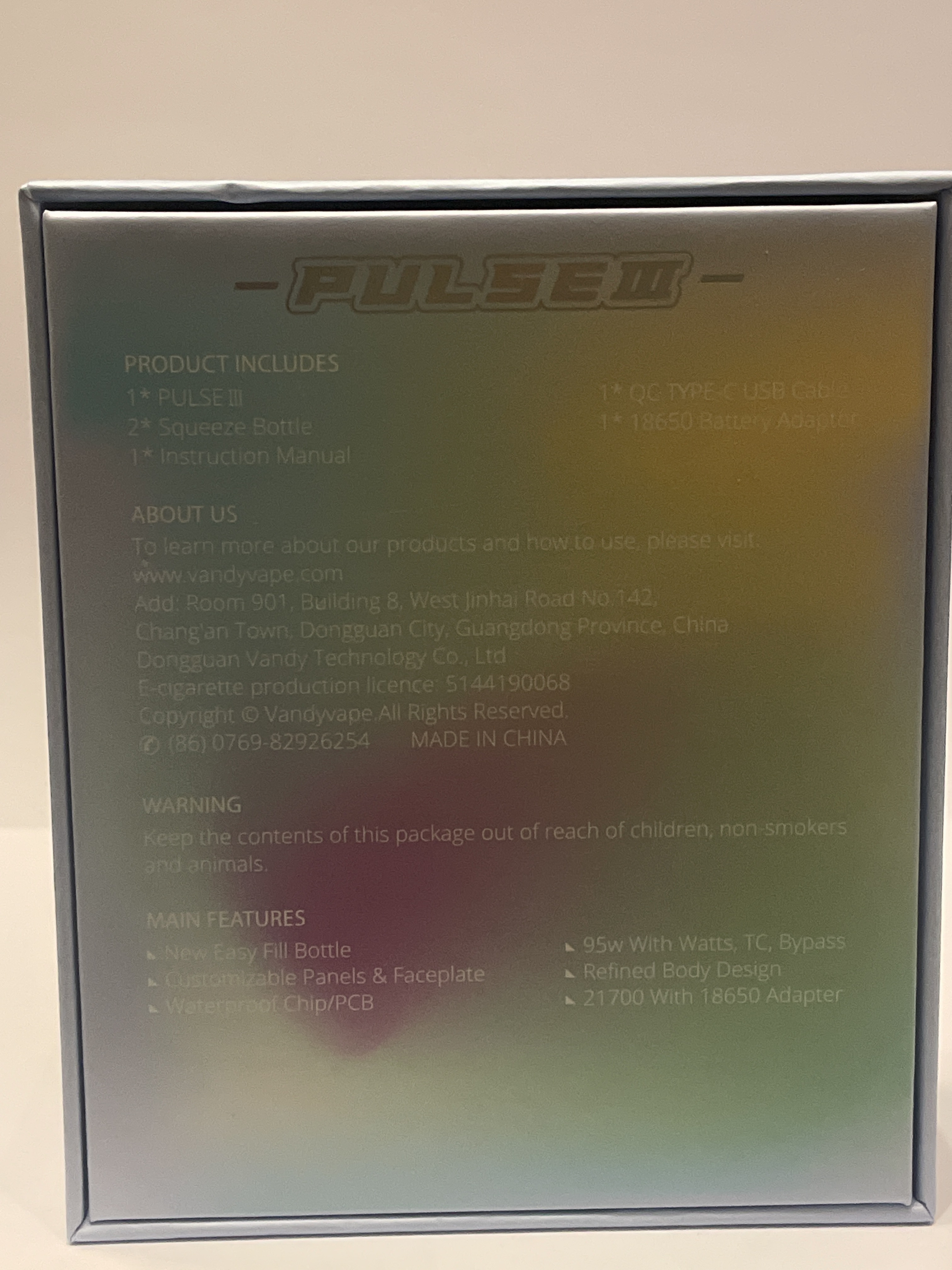 The product comes in a rectangular box of varied colors, thus forming a mixture of greens, blues, yellows and purples. This makes it a very attractive packaging in combination with the silver letters. In the center we see the shape of the product in question, the Pulse III, in fact, its own name is indicated above. Below right we see that it is made in collaboration with Tony B, like many of the Vandy Vape products.
