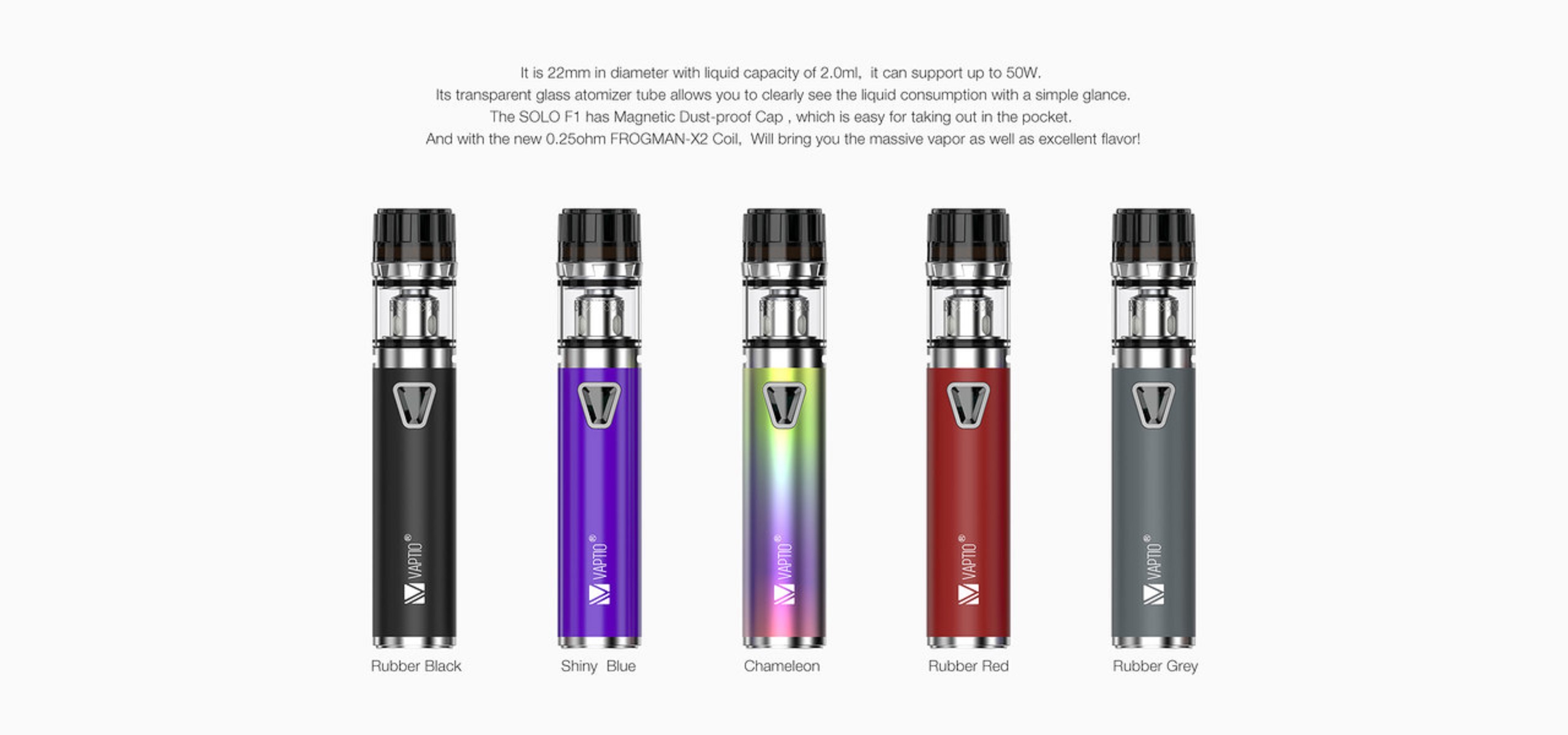 Vaptio whilst getting more appreciated all the time still go under the radar for many yet they manufacture some excellent vaping products with good build quality at an affordable price. The Solo F1 has actually been around a while as we have already seen the release of the Solo F2 a while back but it's still readily available and shopping around can get it at a very low price. The Solo F1 is an 22mm in diameter AIO vape pen that comes with 2 0.25ohm Frogman coils which are a mainstream size so many coils including Baby beast coils will fit. The pen works efficiently giving better than expected battery life and comes with a very securely fitting drip tip cover that fits on the end of the device when removed for vaping, alternatively if in a rush for a quick vape the cover allows for vaping while installed. The Solo F1 is made of Stainless Steel and comes in 5 colour options which includes 3 with a Rubberised finish, so let's give the Solo F1 a look!
