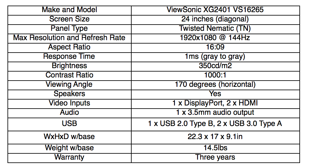 The Viewsonic XG2401 (See it on Amazon) is the company's mid-range 24" gaming monitor and it costs a bit more than the base models due to the fact that it has FreeSync adaptive refresh rate technology, which is all the rage these days. It has HDMI and DisplayPort video inputs for fast-paced gaming, three USB ports for peripherals, and a 144Hz refresh rate too (DisplayPort-only) making it a well-equipped piece of gaming hardware. Before we jump in, let's take a look at the manufacturer-supplied specs: