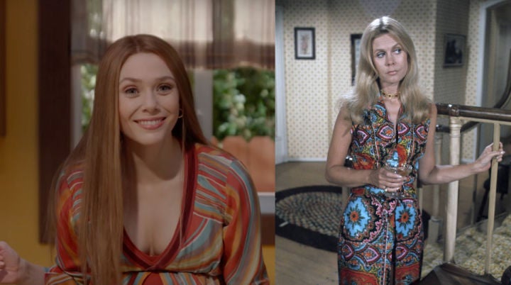 For the '60s/'70s, the style wildly changes, color floods in, and Wanda looks a lot like a blend of Susan Dey from The Partridge Family and Elizabeth Montgomery from Bewitched (above right). The Bewitched nods are, of course, expected here given Wanda's own powers. Continuing in the '60s/'70s - this is totally The Brady Bunch's living room! Those stairs. That brick. No, it's not the exact same blueprint, but it's definitely meant to evoke it. And why not? Disney owns ABC. Here's the Bradys' classic domain.
