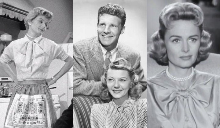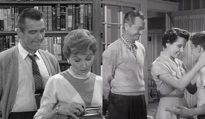In the black and white scenes, Vision's got a very '50s husband/dad vibe, borrowing from the sweater and tie looks seen in The Dick Van Dyke Show, Father Knows Best, and Leave it to Beaver. Here's Leave it to Beaver's Ward Cleaver, played by Hugh Beaumont from 1957 to 1963, and Robert Young as patriarch Jim Anderson on Father Knows Best, which ran for over 200 episodes throughout the '50s. Wanda is sporting a ton of hallmarks from '50s/'60s TV housewives, from Barbara Billingsley's June Cleaver to Harriet Nelson from The Ozzie and Harriet Show (which was the longest-running sitcom of all time until It's Always Sunny in Philadelphia just tied its record in 2019). Wanda's biggest influence here might be Donna Stone, played by Donna Reed (above right) on The Donna Reed Show, which ran from '58 to '66. In this moment, Wanda and Vision seem to be phasing out of the '50s sitcom, though only she is in color so it's another indicator that all of this, including Vision, is all in her mind somehow. Either way, the living room set up is very reminiscent of The Dick Van Dyke Show. Here's The Dick Van Dyke Show layout, with the door in the upper right corner.