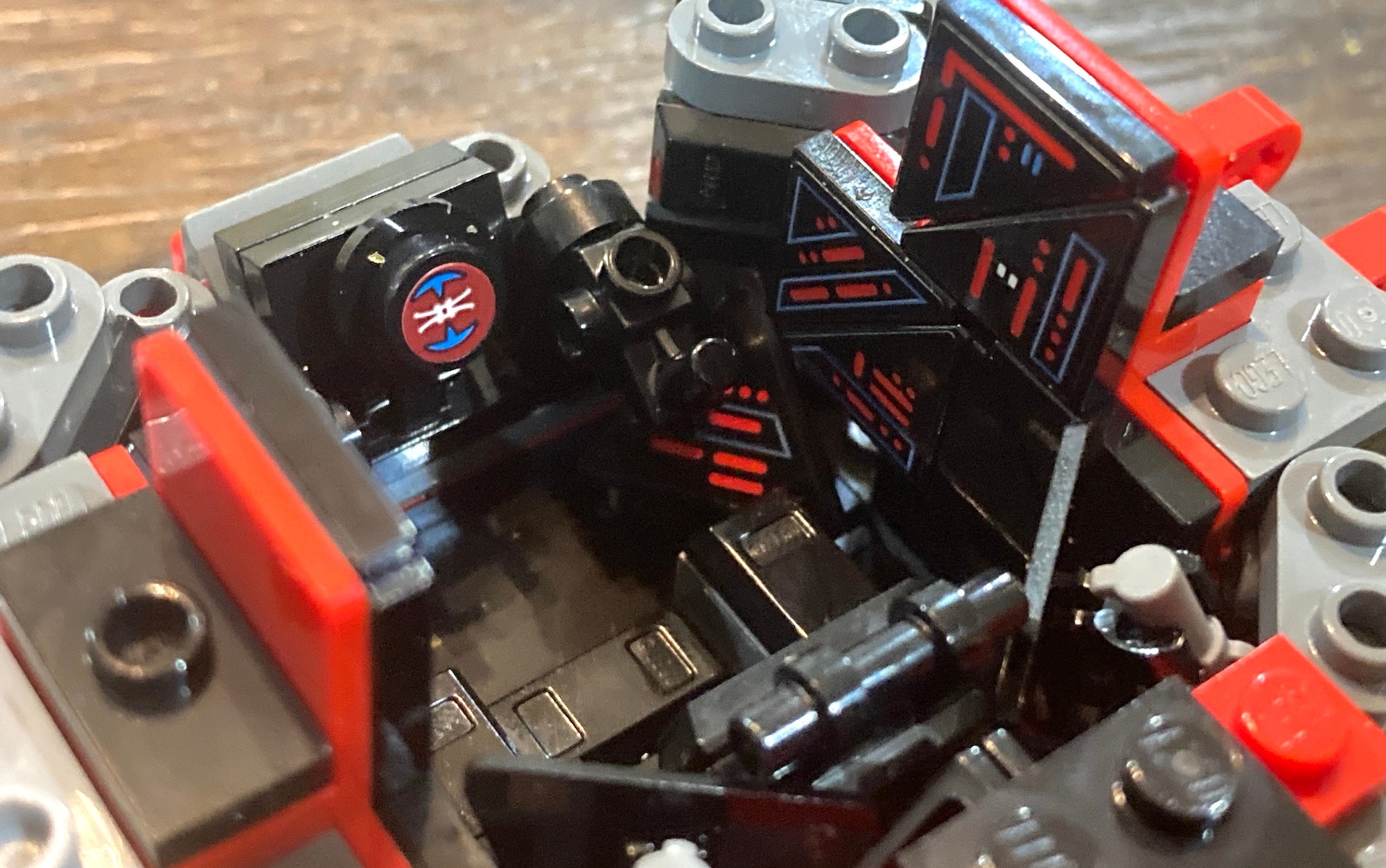 The LEGO Tie Interceptor is a simple, straightforward build. You first construct the body of the ship, starting with the cockpit and working your way outwards. The cockpit contains a single chair, steering controls, and stickered plates meant to represent monitors and dashboards. The top of the ship opens on a snap hinge, allowing the pilot to climb in.