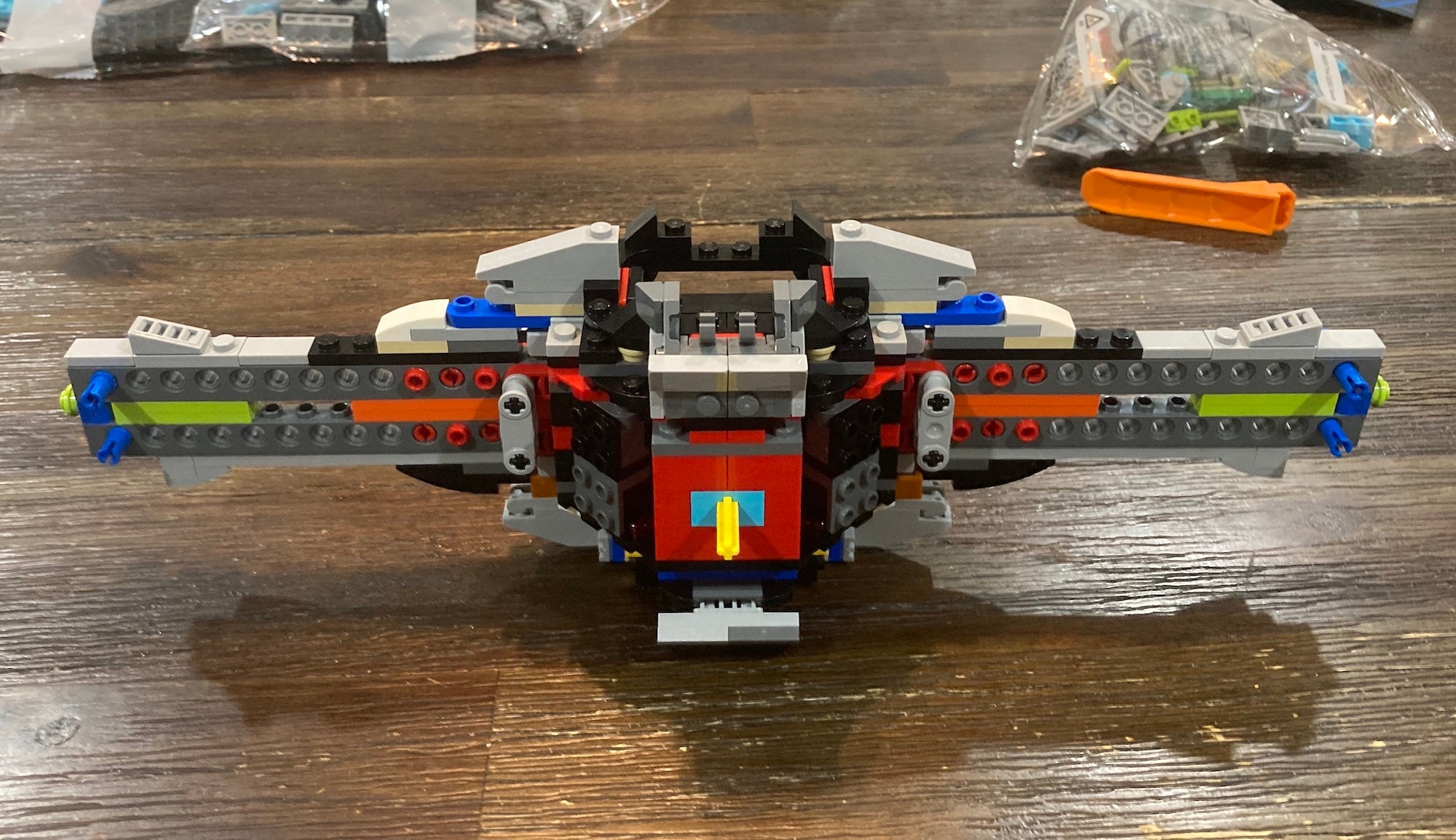 Lastly, you build the four wing flaps. The instructions tell you to add each wing as you build it, but I decided to wait until all four were finished before attaching any of them. It felt more visually engaging–to see the final build in its entirety rather than having it fed to me, two bags of bricks at a time. The flaps hang on a hinge, which bend inward to create the spaceships' convergent appearance.