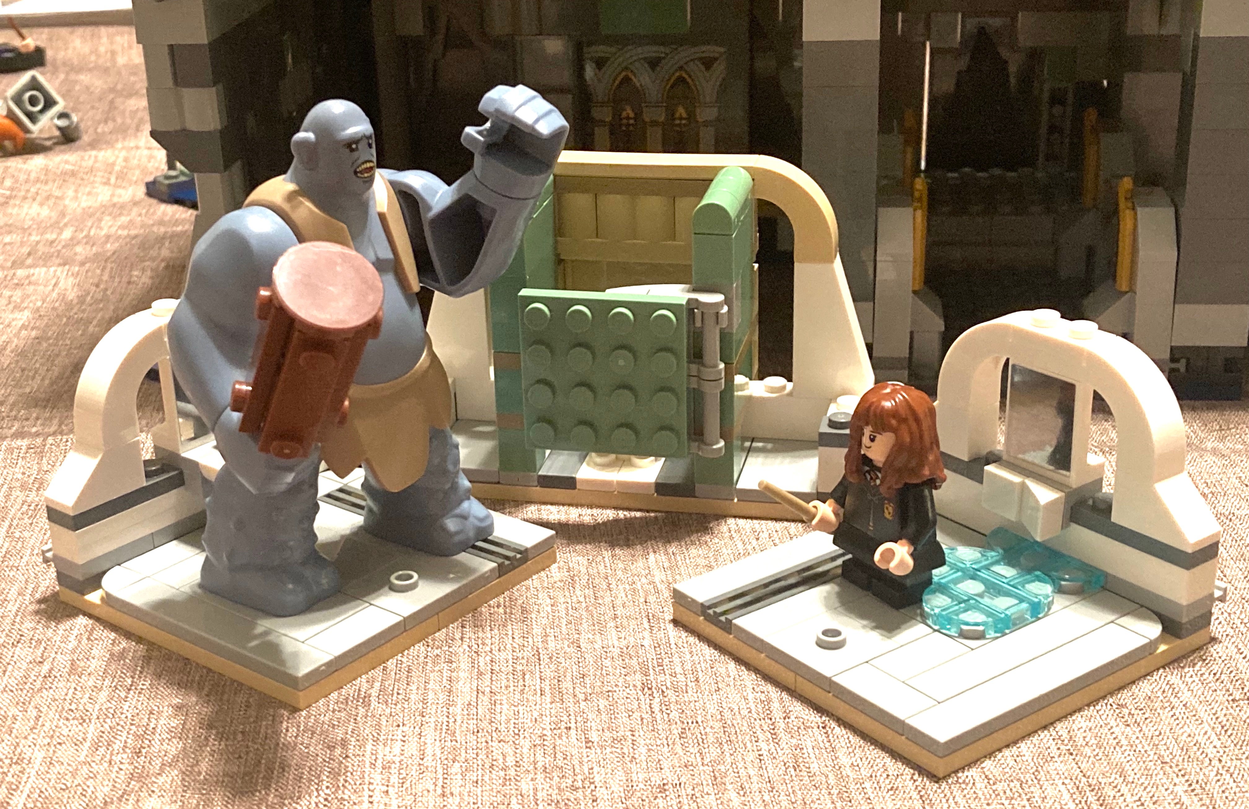 The dining/reception hall contains the flags for all four Houses, tables laden with food, floating candles, and clouds on the ceiling. Beneath this is a dungeon (accessible from a secret rockface entrance), which includes the Hufflepuff Common Room, a narrow corridor for skulking about, and the girl's bathroom, where Harry, Ron, and Hermione battle a troll in their first year. The LEGO troll looks appropriately doltish, with a tiny head and a big club.