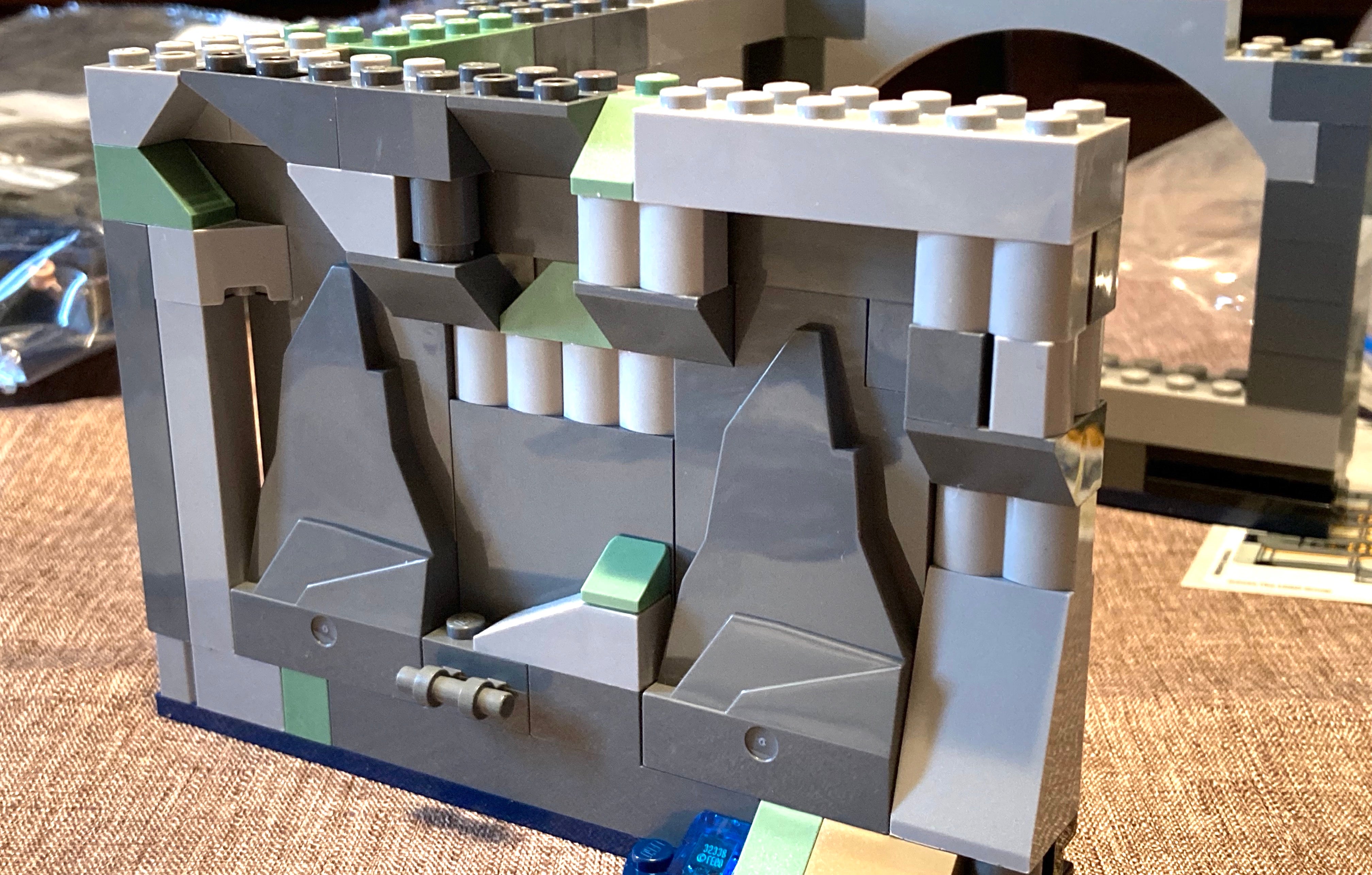 You build the Great Hall in phases. First, you build the rocky cliffs and the footprint of the building. This bodes well for the future—a Chamber of Secrets or a Slytherin Common Room could easily slot into the final castle, without reverse engineering a solution to somehow stack and meld them together. It also allows for a descending walkway, which leads down the cliffs to the Boathouse.