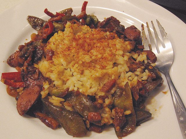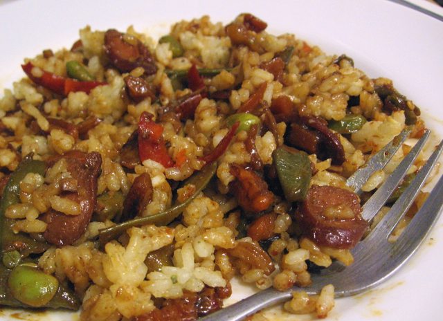 Made some Calrose rice, then did a little stir-fry with Asian veggies, smoked sausage, slivered Hatch chile pecans, lots of garlic, ginger paste, chile oil, Sambal Olek, Shoyu organic soy sauce, Hoisin sauce, 5-spice, a few drops of Three Crabs fish sauce, and peppers. Did not use a bagged sauce for this one..lol...;)