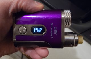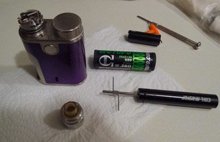 Build my new Gas Mods Pallas RTA. Got it because it looks nice on a CF Mod, will fit a Pico 75, and 2 reviewers said it was simple to wick. They lied. Okay, they didn't lie, i'm just bad at it. 3rd try, though, with my mix, and my CF turns into a really big Marlboro Light (which was never my brand but here we are).