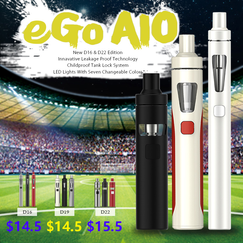 Joyetech eGo AIO D22 Kit features all-in-one style and fashionable appearance with streamed line, which adopts best anti-leaking structure for atomizer with 2ml ejuice capacity, and unique spiral mouthpiece structure for better vaping. It has 22mm diameter and 1500mAh output power. It uses childproof lock design and adjustable airflow by ring. It also adopts top cap ejuice filling way.